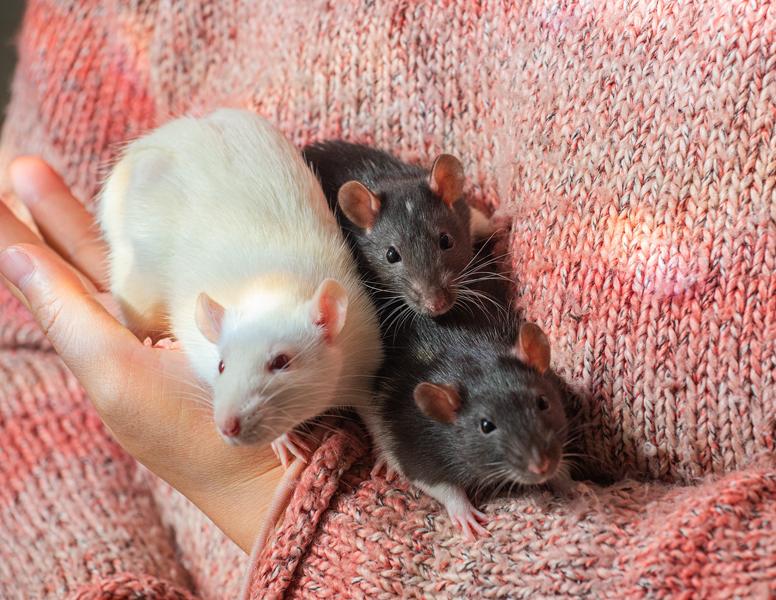 Of the three, Penny (black and white, no head spot) is definitely the bravest. She’s constantly trying to get everyone to play – including the humans! She loves to wrestle your hand and chase it around, if you are game. Petunia (albino) is just as curious of Penny, but a little bit more cautious. It will take her a few days to fully trust and come out of her shell. But once she does, she’s just as boisterous. Petunia loves to groom the short hairs on the back of your head! Finally, there’s the sensitive girl, Penelope. She definitely needs her friends around to feel confident. Even then, sudden movements and sounds can still spook her. She has definitely started to feel more confident, the longer she has the same stable environment and routine.